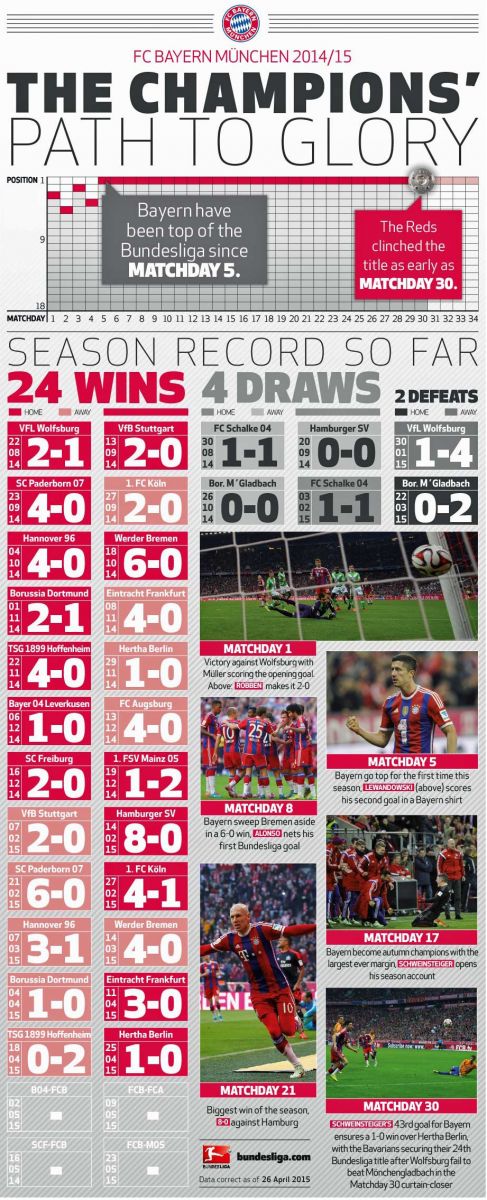Правда, после финального свистка игроки «Баварии» еще не знали, что уже в этом туре оформят чемпионский титул, поскольку «Вольфсбург» имел шансы отстрочить это событие как минимум на неделю. Однако для этого необходимо было побеждать в Гладбахе, чего, к сожалению фанов «волков» не произошло. «Теперь мы можем сосредоточиться на Кубке Германии и Лиге чемпионов», - сказал после матча Гвардиола, который также рад возвращению в общую группу Бантия и Роббена.![]()