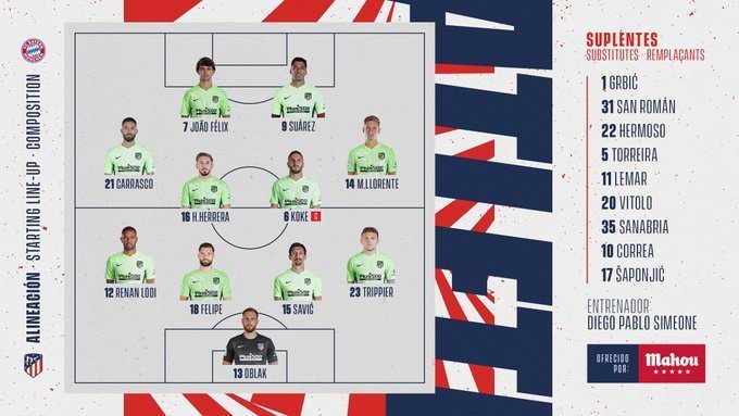 «Атлетико»: Облак, Триппьер, Савич, Фелипе, Ренан Лоди, Эррера, Коке (Торрейра, 79), Льоренте (Лемар, 79), Карраско (Витоло, 76), Луис Суарес (Корреа, 76), Жоау Феликс