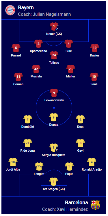 Запас: Нюбель, Хави Мартинес, Боатенг, Дэвис, Сарр, Ньянзу, Мусиала.