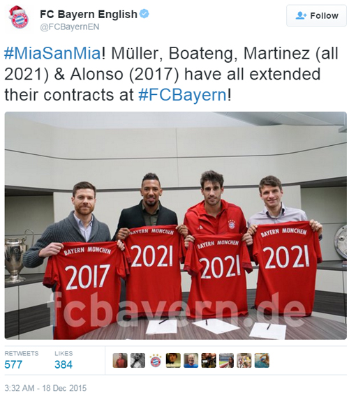 Мюнхенская «Бавария» продлила контракты с защитником Джеромом Боатенгом, полузащитниками Хаби Алонсо и Хави Мартинесом, а также нападающим Томасом Мюллером, сообщает пресс-служба немецкого клуба.Контракт Алонсо рассчитан до 2017 года, три других исполнителя будут защищать цвета немецкого чемпиона до 2021-го. О финансовых подробностях новых контрактов игроков ничего не сообщается..jpg)